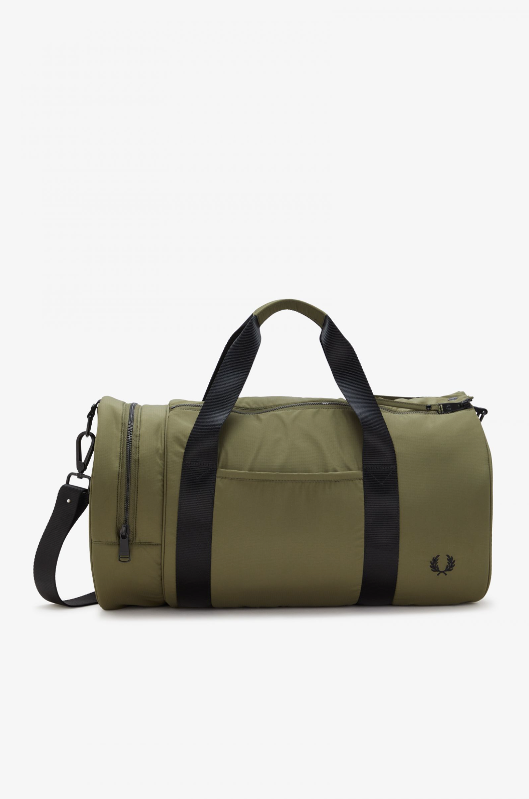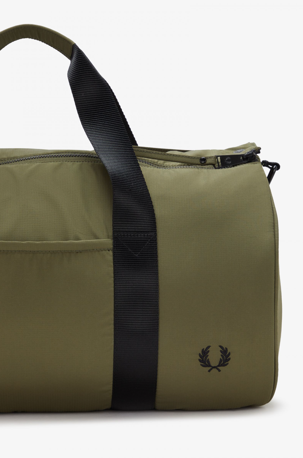 Our classic barrel bag with piping detail in tough nylon ripstop. Used by sportsmen and women for decades, the barrel bag is a sporting staple (and it transfers nicely to summer getaways and cross-country travel). With black webbed straps, piping detail, and branded hardware, our ripstop barrel bag is smart, durable, and very Fred Perry.